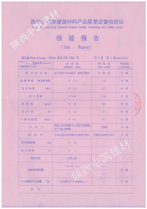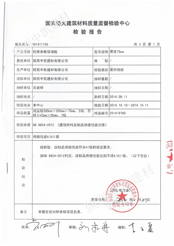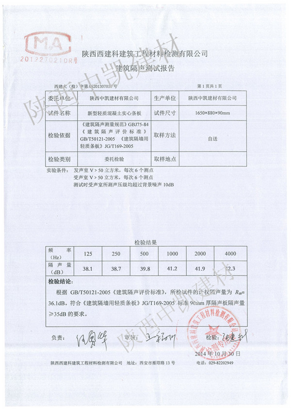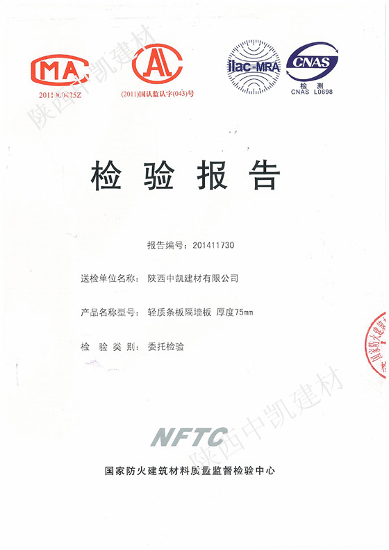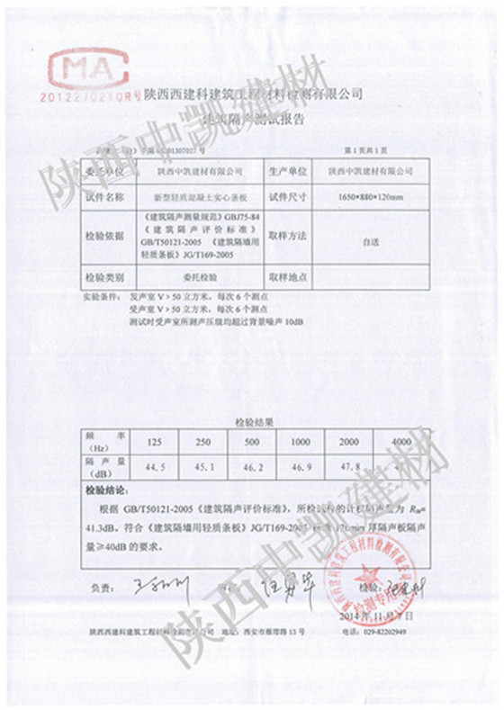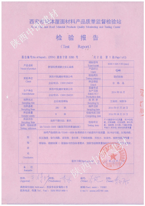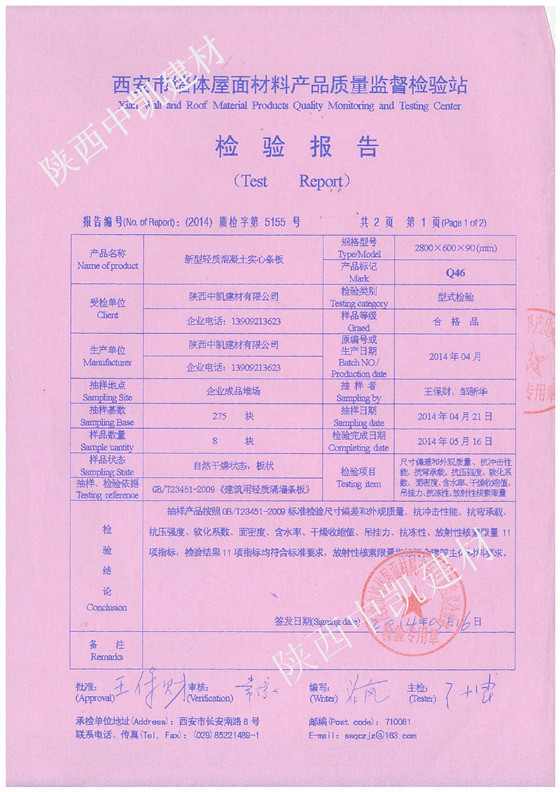 新型輕質(zhì)混凝土實心墻板檢驗報告是由陜西中凱建材在2014年做的檢測報告